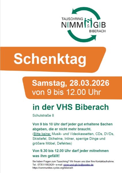 Der Tauschring „Nimm und Gib“ veranstaltet am Samstag, 29. November von 9 bis 12 Uhr einen Schenktag in der VHS Biberach, Schulstraße 8. Es gibt viele gut erhaltene Gegenstände, die nicht mehr gebraucht werden und dennoch zu schade zum Wegwerfen sind und die andere vielleicht schon lange suchen. Der Schenktag bietet die Gelegenheit, Wünsche zu erfüllen. Von 9 bis 10 Uhr darf jeder gut erhaltene Sachen abgeben, die er nicht mehr braucht, ausgeschlossen sind Musik- und Videokassetten, CDs, DVDs, Skistiefel, Skihelme, Inliner, sperrige Dinge und größere Möbel sowie Defektes. Von 9.30 bis 12 Uhr darf jeder mitnehmen was ihm gefällt. Nähere Informationen sind erhältlich unter der Tel.-Nr. 07351/1882428, E-Mail-Adresse: nimm-und-gib-bc@posteo.de, oder https://communities.cyclos.org/biberach.