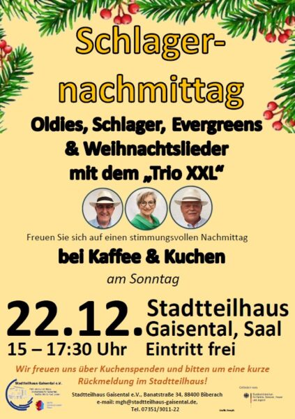 Von 15 bis 17:30 Uhr verwandelt sich der Saal des Stadtteilhauses in einen Treffpunkt für alle Schlagerfreunde. Bei Kaffee und selbstgebackenem Kuchen darf geschunkelt, getanzt und natürlich kräftig mitgesungen werden. Auf dem Programm stehen beliebte Schlager und Evergreens wie „Griechischer Wein“, „Oh My Darling“ oder „Die kleine Kneipe“ – Musik, die Herz und Beine gleichermaßen bewegt.